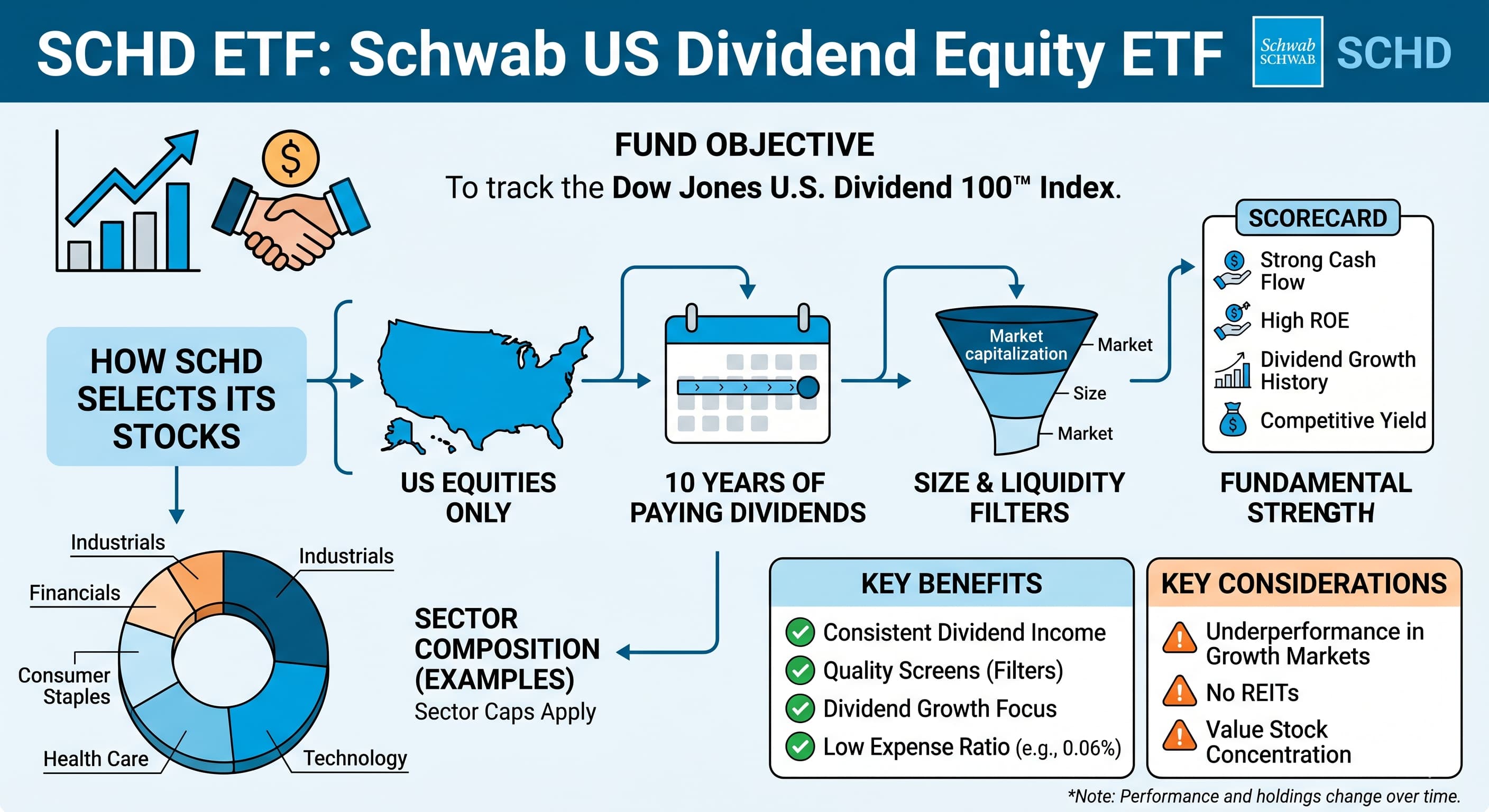 현재 글로벌 배당 ETF의 제왕은 단연 미국의 'SCHD (Schwab US Dividend Equity ETF)'입니다. 10년 이상 꾸준히 배당금을 늘려온(배당성장) 미국 우량 기업 100개에 투자하는 상품이죠.