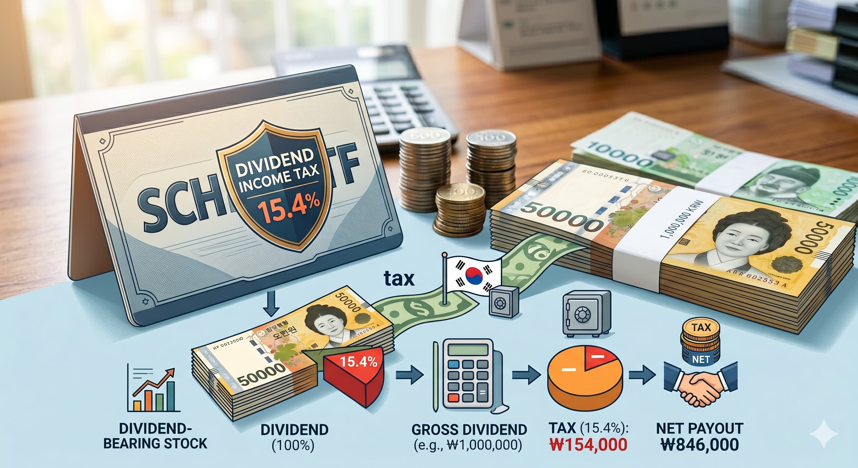 배당금이 통장에 꽂힐 때마다 국가는 귀신같이 15.4%의 배당소득세를 떼어갑니다. 예를 들어 매달 100만 원의 배당을 받아야 하는데, 세금을 떼고 나면 내 손에 들어오는 돈은 84만 6천 원으로 쪼그라듭니다.